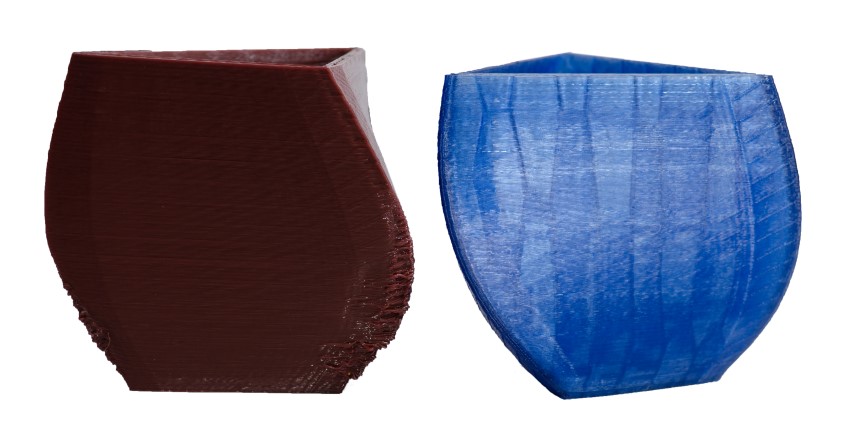 PLA-Druck links ungekühlt, rechts gekühlt. Ein Unterschied wie Tag und Nacht